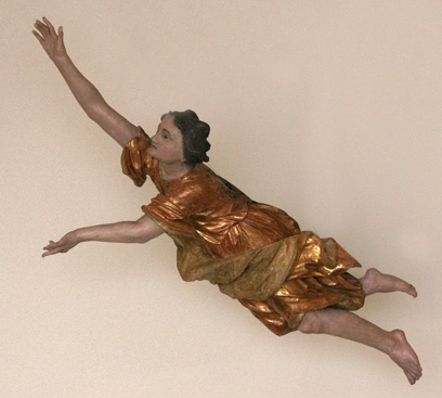 Unsere Engel, schlanke elegante Gestalten, mit schwungvollen Draperien, nach oben gestreckten Armen, feingearbeiteten Händen, klaren ausdrucksvollen Gesichtern mit schönen großen Augen – der linke blickt nach oben, der rechte nach unten- zeigen ganz die Charakteristika der künstlerischen Arbeitsweise von Johann Baptist Straub, dem Schöpfer des Fürstenzeller Hochaltares. Gleichklang aber keine Wiederholungen, Symmetrie – aber nicht starr, sondern im Geiste des Rokoko schon aufgelöst. Auch die Kleidung der Engel differiert. Die Haartracht ist ähnlich. Erstaunlich ist wie gut der Bildhauer das Schweben der Engel durch die Haltung ihrer Arme und Beine darstellte. In graziöser Bewegung fliegen sie förmlich nach oben. Die Körper haben eine leichte Drehung in der Hüfte, die fast vollrund gearbeiteten Gestalten bieten von allen Seiten einen noblen Anblick.